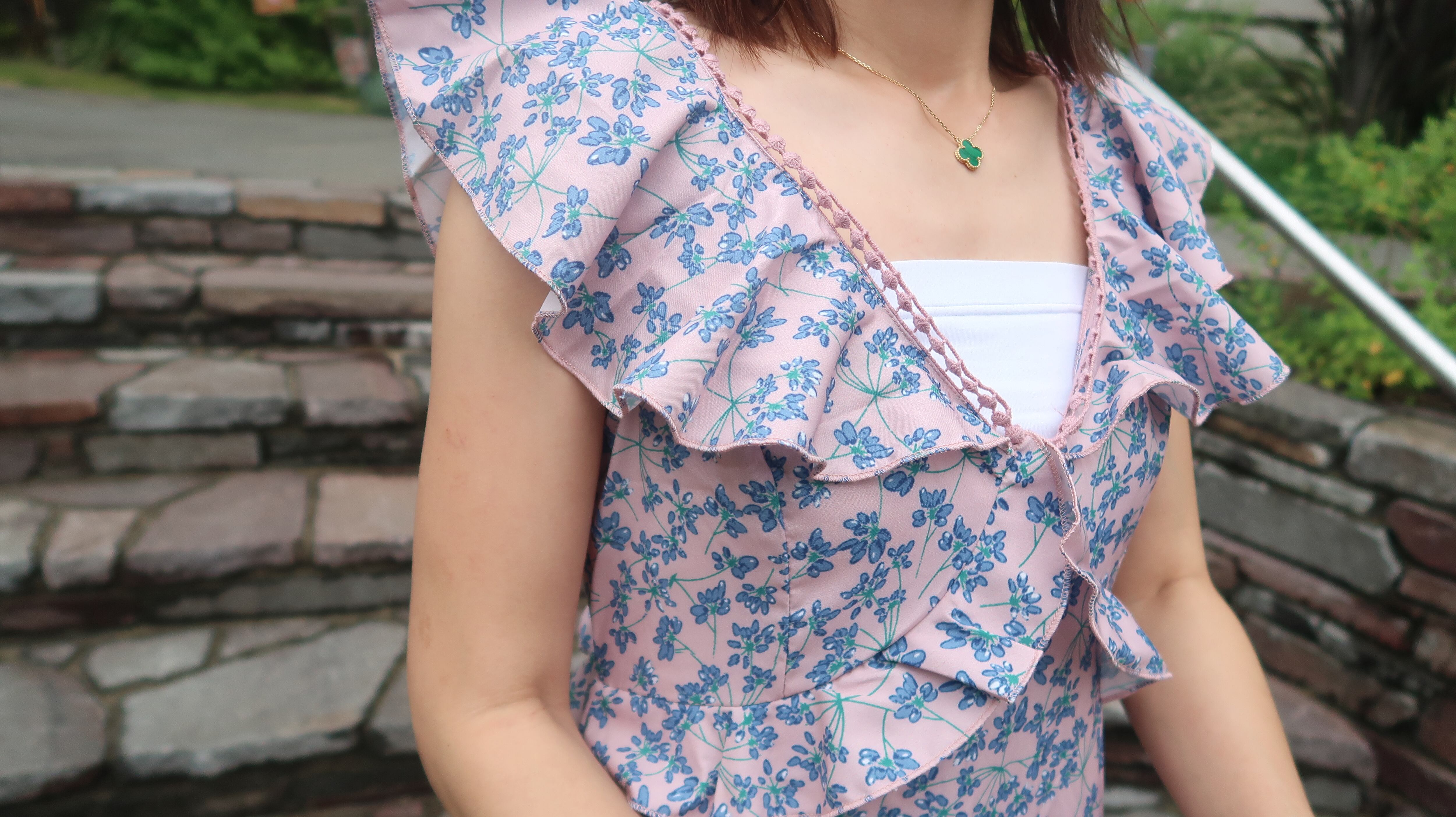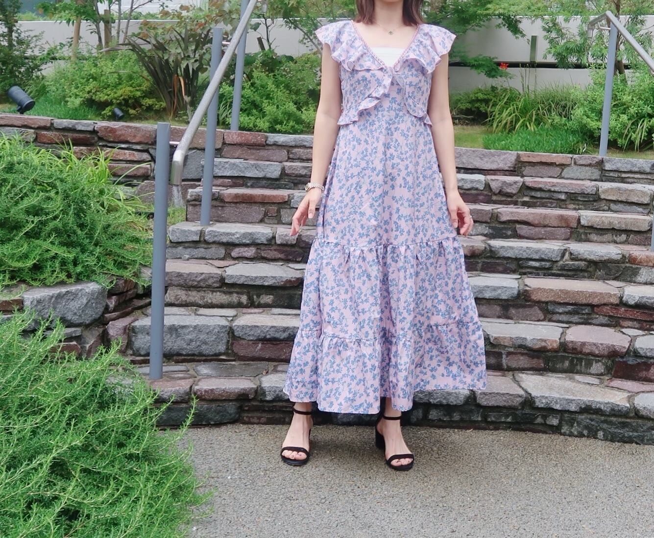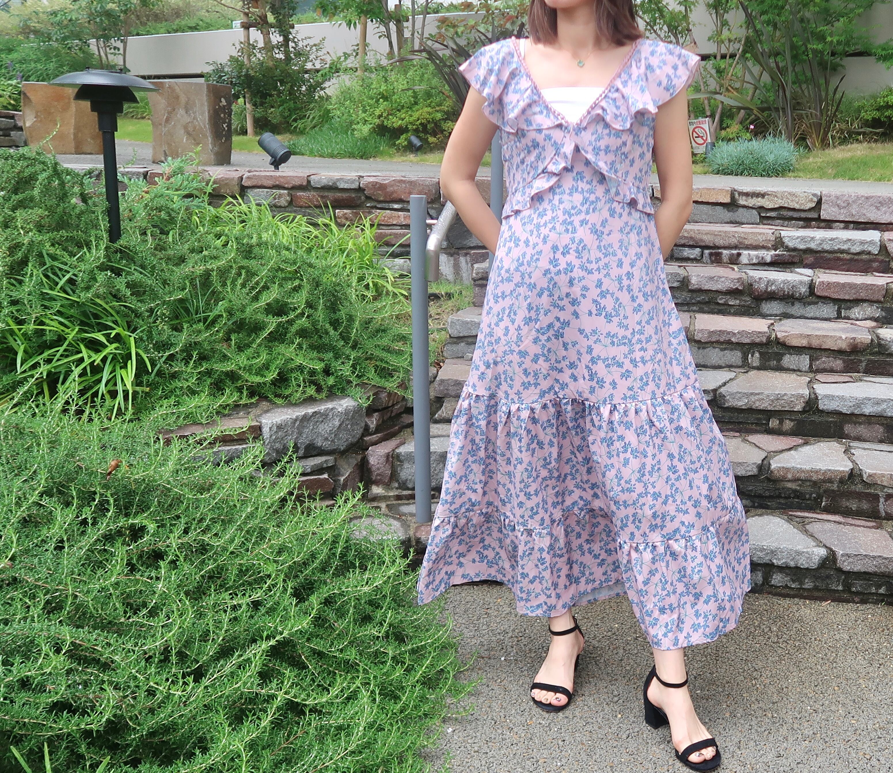 淡いピンク色にブルーの小花のフリルショルダーワンピース